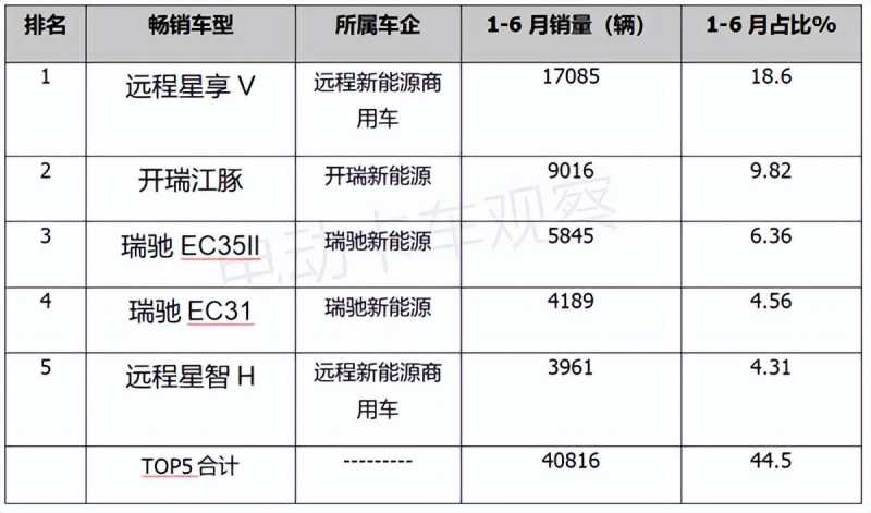 开瑞新能源累计销售10284辆,同比大增84.9%,跑赢大盘,也成为拉动行业增长的主力企业,市场占比11.2%,居第三。