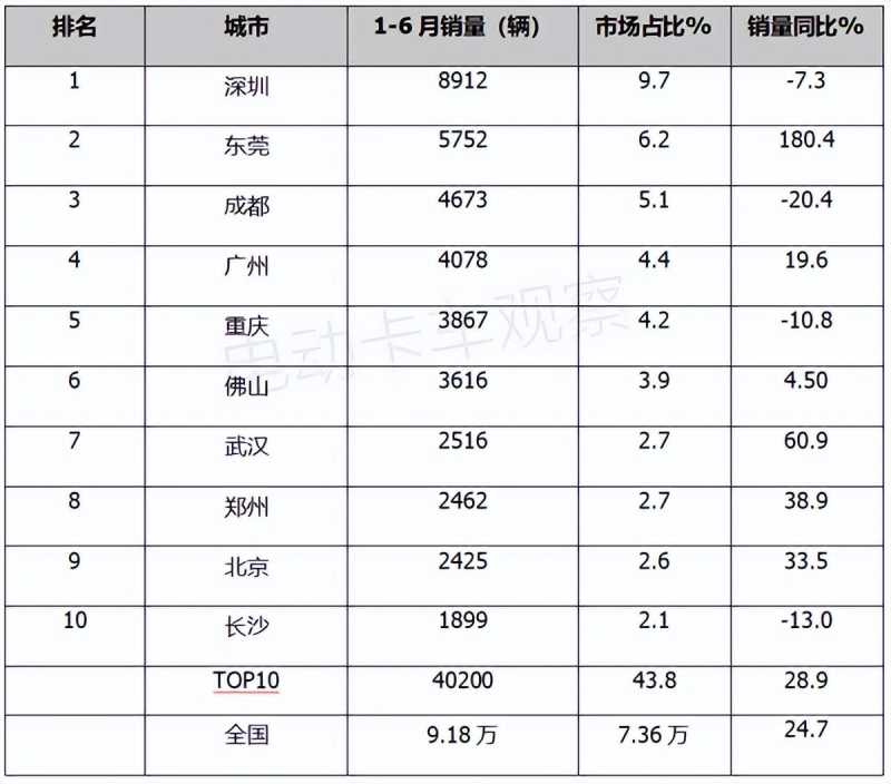 2023年上半年新能源物流车TOP10城市销量、同比及占比如下: