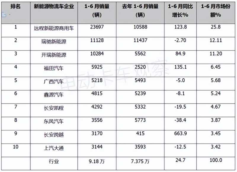 2023上半年新能源物流车Top3:远程、瑞驰、开瑞
