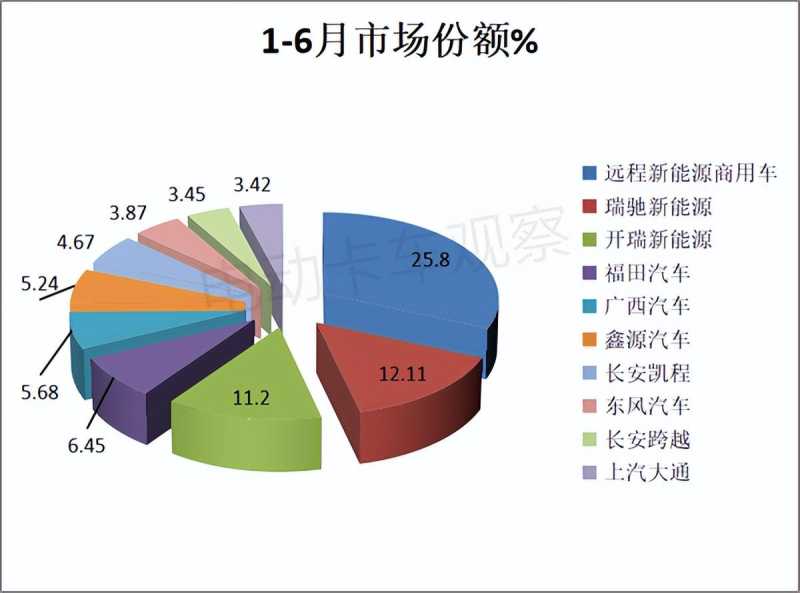 远程新能源商用车累计销售23697辆,是唯一累销超2万辆的企业,同比大涨123.8%,跑赢大盘,成为拉动行业增长的“主力军”,市场占比25.8%,强势霸榜。