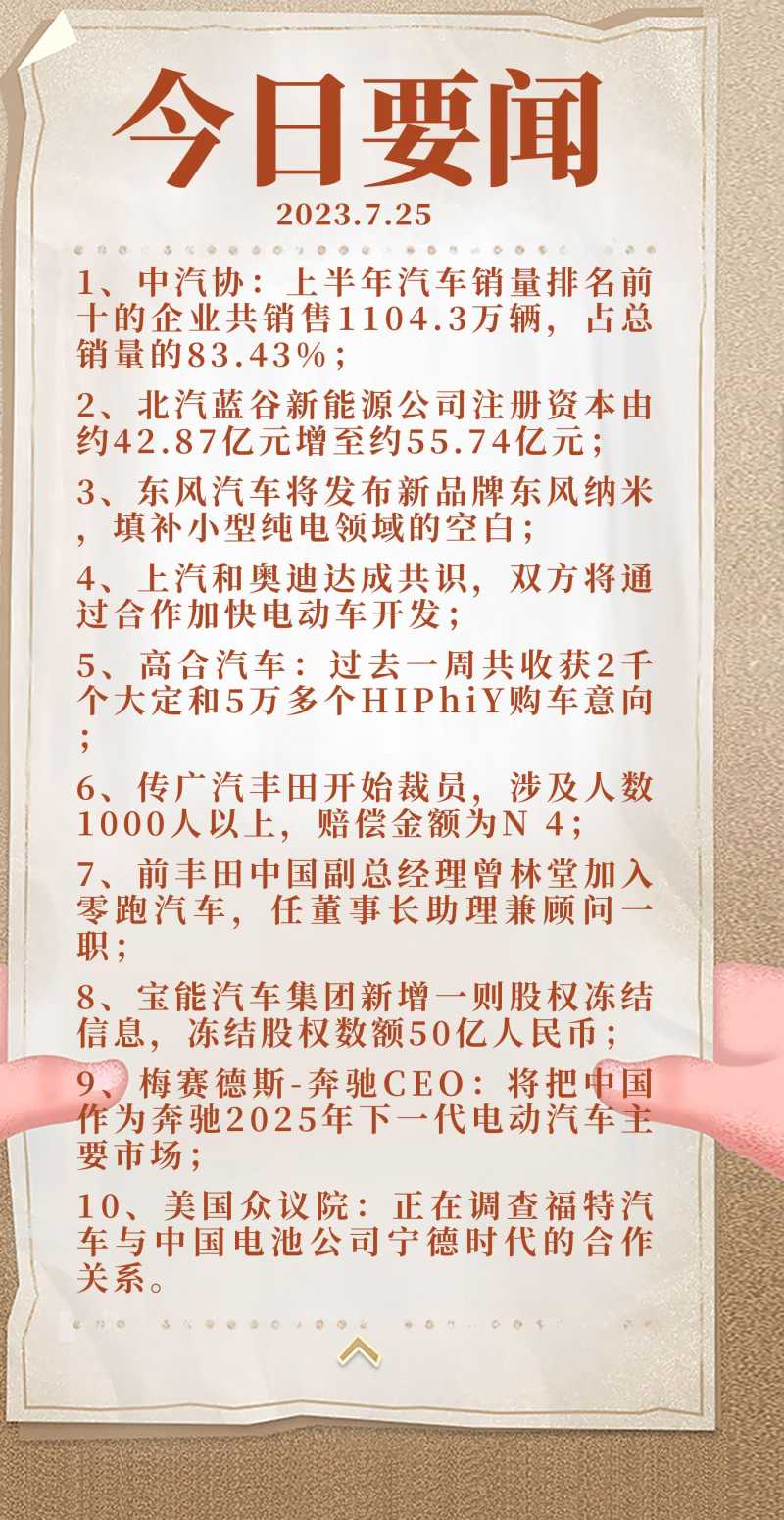 1、中汽协:上半年汽车销量排名前十的企业共销售1104.3万辆,占总销量的83.43%
