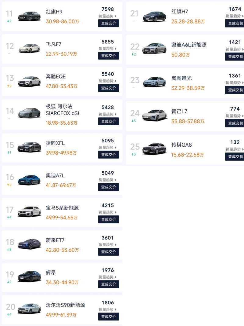 接下来,红旗H9排名第十一名,红旗也是国内公认的豪华品牌,这个销量数据只能说中规中矩。飞凡F7、蔚来ET7、红旗H7、岚图追光和智已L7这些自主品牌也都有上榜,捷豹XFL、奔驰EQE、奥迪A7L和辉昂这些传统中大型轿车的销量表现一般,其中辉昂半年只卖了1976辆。宝马5系新能源、沃尔沃S90新能源和奥迪A6L新能源销量一般,消费者并没有因为它们是豪华品牌就过分青睐。销量最低的是传祺GA6,在今年上半年仅仅卖了132辆。对于2023年1-6月中大型轿车销量排名:比亚迪汉夺冠,001、五系前十。大家怎么看?