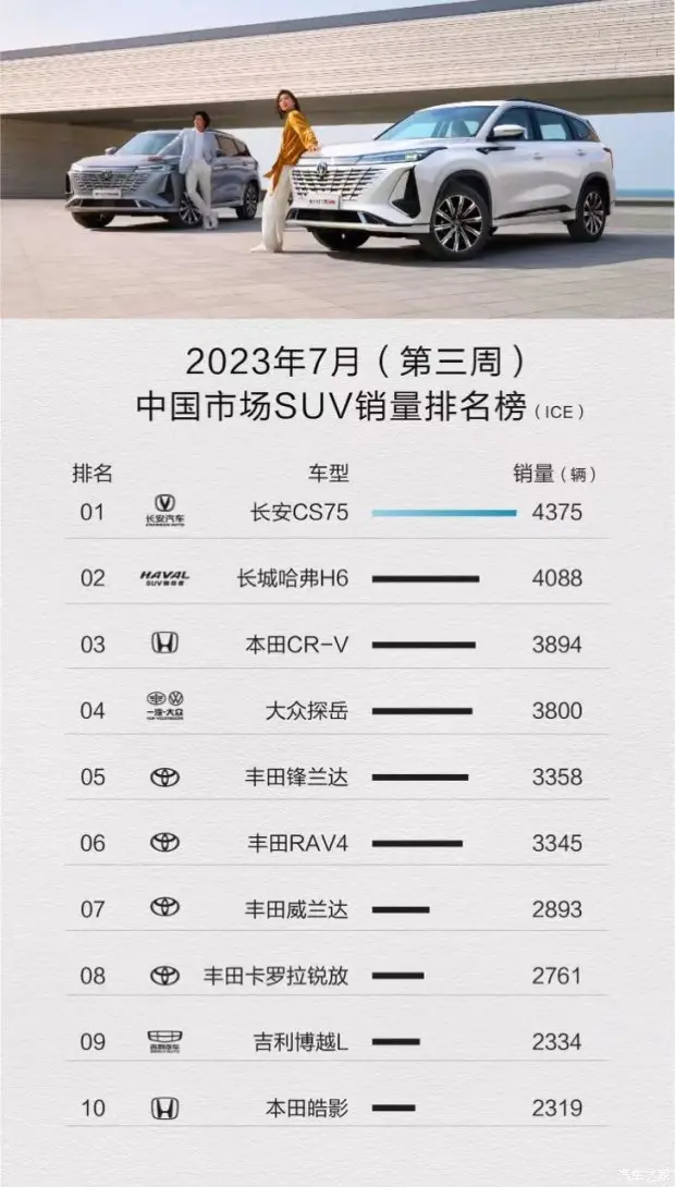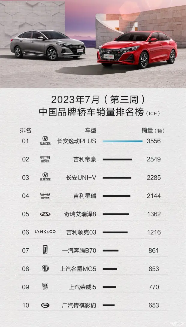 2023年7月第三周产品销量榜单,7月第三周长安汽车排名中国品牌乘用车销量榜第一,7月第三周逸动PLUS排名中国品牌轿车销量榜第一,7月第三周CS75排名中国市场SUV(含合资)销量榜第一。