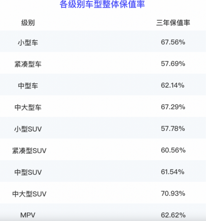 具体到细分市场中去看,中大型SUV以70.93%的三年保值率排名第一,其次是小型车,三年保值率为67.56%,中大型车以67.29%的三年保值率排名第三。