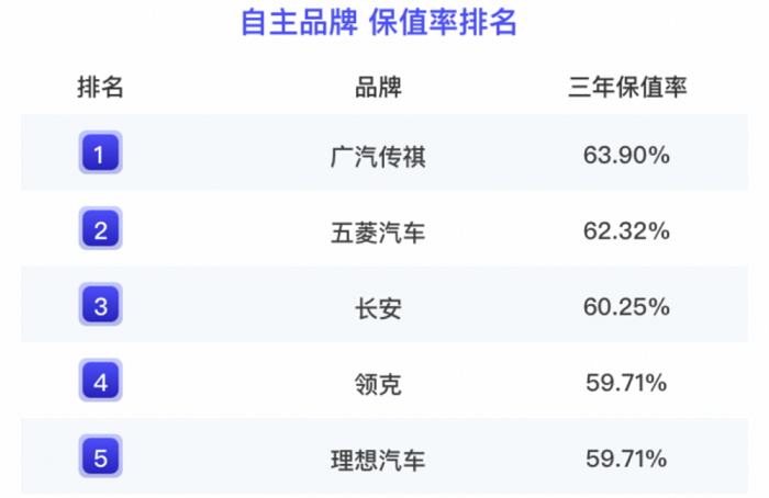 在自主品牌保值率榜单中,广汽传祺凭借M6、M8的表现,以63.9%的三年保值率排名第一;排名第二的是五菱汽车,三年保值率为62.32%;长安以62.25%的三年保值率排名第三。