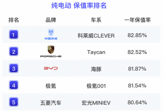 在纯电动车型中,荣威科莱威CLEVER以82.85%的一年保值率排名第一,保时捷Taycan以82.52%的保值率紧随其后,比亚迪海豚以81.87%的保值率排名第三。极氪001、五菱宏光MINI EV、蔚来ET7、比亚迪宋PLUS新能源、特斯拉Model 3、奇瑞新能源小蚂蚁等车型的保值率也表现出色。