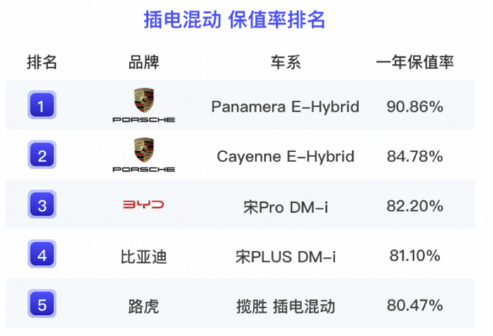 在插电混动车型方面,比亚迪在保值率排名前15名中占据了6个席位,成为最大赢家。其中,比亚迪宋Pro DM-i一年保值率为82.20%,排名榜单第三位,仅次于保时捷两款插电混动车型。