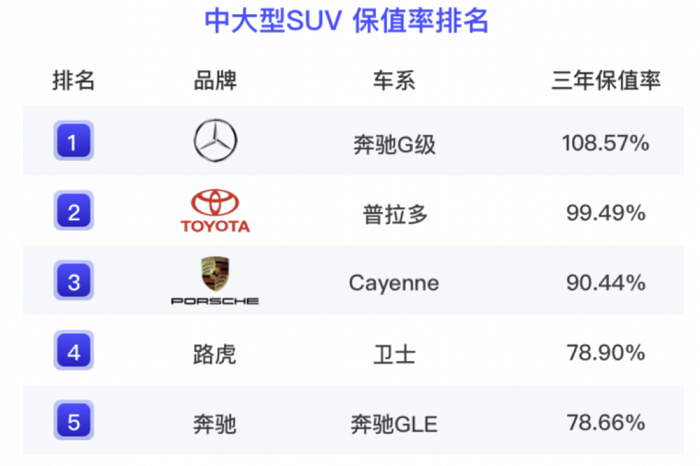 在具体车型中,奔驰G级车三年保值率高达108.57%,排名第一;其次是雷克萨斯LM,三年保值率达到103.74%;丰田埃尔法排名第三,三年保值率为100.63%;丰田普拉多以99.49%的三年保值率排名第四;保时捷Cayenne则以90.44%的三年保值率排名第五。另外,丰田威尔法、保时捷Macan、雷克萨斯ES、牧马人、汉兰达、路虎卫士、奔驰GLE、别克GL8等多款车型三年保值率也都超过75%。