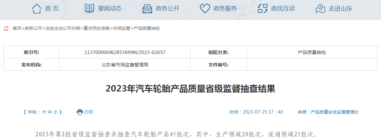 中国质量新闻网讯 近日,山东省市场监督管理局发布2023年汽车轮胎产品质量省级监督抽查结果。2023年第2批省级监督抽查共抽查汽车轮胎产品45批次,其中,生产领域20批次,流通领域25批次。