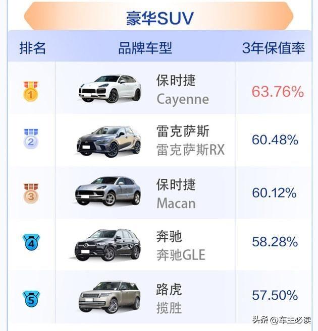 保时捷的豪华地位加较强的品牌溢价能力,拉高了旗下产品的保值率,Cayenne和Macan分别位于榜单的第一、三名;雷克萨斯RX回归榜单,以60.48%的保值率拿到亚军。豪华SUV市场的整体保值率水平较高,但近半年波动也更大,受新车端优惠政策影响,部分产品保值率下滑明显。