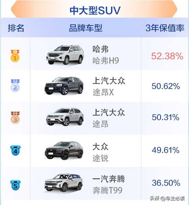 在中大型SUV市场中,哈弗H9以52.38%的保值率夺得冠军,去年的冠军途昂今年排名第三,保值率50.31%。途锐由于产品数量相对较少,整体保值率水平虽有下降,但相对下降幅度不大;相较于其他类型SUV,中大型SUV整体保值率水平偏低,较高的车型价格导致市场保有量较低。