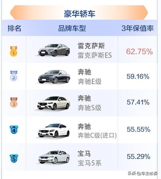 豪华轿车市场的整体排名变化不大,但整体保值率水平下降较多,主要是在新车市场上,其价格也出现了明显松动;雷克萨斯ES保值率依旧领先,62.75%的保值率数据相比2022年68.08%下降明显,这也与终端销售价格松动有一定关系。除此之外,上榜的奔驰3款车型和宝马1款车型,三年保值率均已跌破60%。