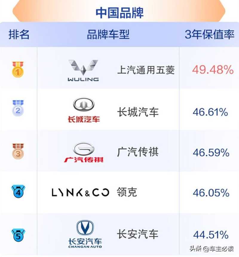 中国品牌虽然加入市场竞争较晚,但也涌现出了一批销量高、口碑好甚至迈出国门走向世界的保值率高的好产品,证明了他们不断向上的生命力和实力。上汽通用五菱、长城汽车、广汽传祺夺得中国品牌保值率前三名,领克、长安汽车紧随其后。