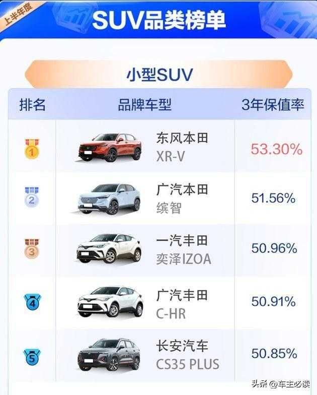 再来看SUV阵营,小型SUV市场继续萎缩,整体保值率水平也出现较大幅度下滑,但日系品牌仍是此细分市场高保值率车型。东风本田XR-V表现稳定,依旧占据榜首位置。中国品牌长安CS35 PLUS首次上榜,且其保值率呈现“逆势增长”趋势,紧紧咬住位列三四的两款丰田,奕泽IZOA与丰田C-HR,大有赶超之势。