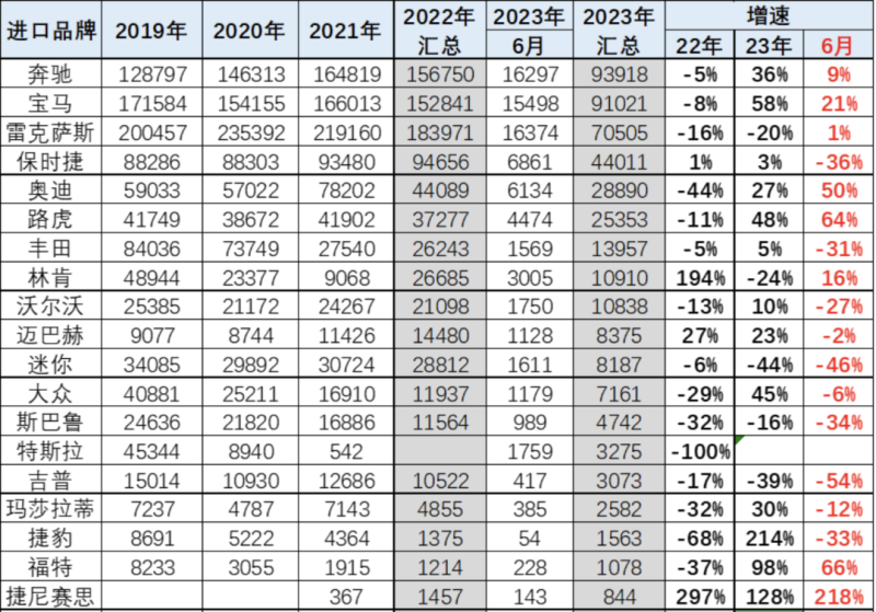 2023年进口规模锐减,1-6月进口仅有35万台,同比下降24%,目前的月度进口量维持在月均6万台左右水平,但高端市场需求较好,近期进口走势较强的是2.0升以上的大排量进口车,市场的高端化走势较强。