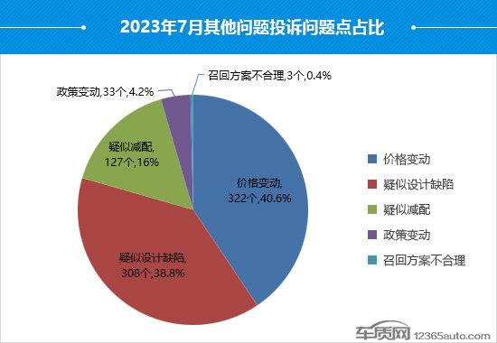 7月份的其他问题中,“疑似设计缺陷”投诉问题点出现明显增长,占比较6月份提高了28.3个百分点。相比之下,“价格变动”投诉问题点环比大幅回落,占比降低了44.6个百分点。