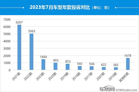 7月,2021款车型的投诉量持续走高,环比上涨68.5%,排名升至首位,投诉增量来自于部分自主品牌新能源车型。本月2023款车型投诉量保持环比增长,较6月份上涨49.1%,投诉大多集中在部分自主和德系品牌车型。