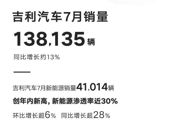 吉利控股集团8月2日公布的销量快报显示,7月份吉利集团销量达到138,135辆,同比增长13%。