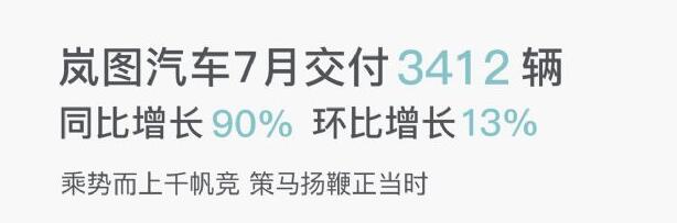 岚图汽车8月1日公布的交付数据显示,7月份岚图汽车共交付3,412辆新车,连续五个月销量超过3,000辆,同比增长90%,环比6月份增长13%。