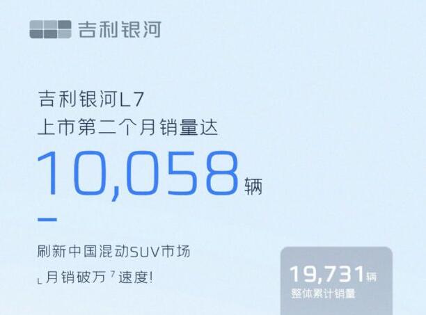 吉利汽车8月2日公布的销量数据显示,旗下吉利银河品牌7月销量达到10,058辆。银河品牌是吉利汽车旗下的全新新能源品牌,目前只有吉利银河L7一款车型在售,新车于5月31日上市,首月销量9,673辆,第二个月销量即突破万辆大关,达到10,058辆。