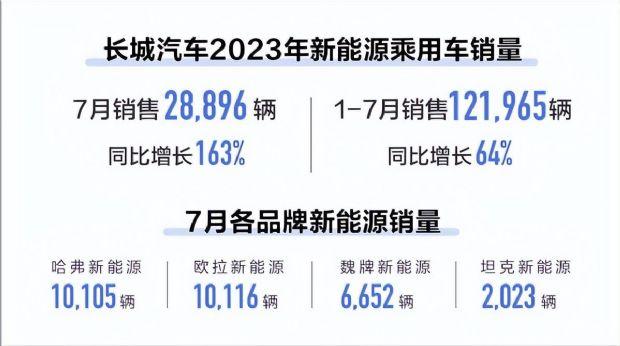 长城汽车8月1日公布了7月新能源乘用车销量数据。数据显示,7月份长城汽车共销售28,896辆新能源乘用车,同比增长163%,高于上月的26,643辆的销量。其中,哈弗品牌新能源车销售10,105辆,欧拉品牌销售10,116辆,魏牌新能源车销售6,652辆,坦克新能源销售2,023辆。