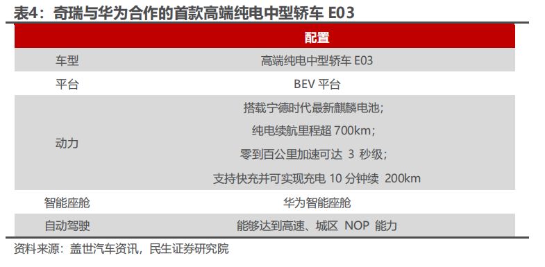 此外,奇瑞正式启动“瑶光2025”战略,电动化、智能化同时发力,与华为合作的首款高端纯电中型轿车E03将于下半年推出。新车基于BEV平台全新打造,搭载宁德时代最新麒麟电池,配备华为智能座舱,在自动驾驶方面能够达到高速、城区NOP能力。