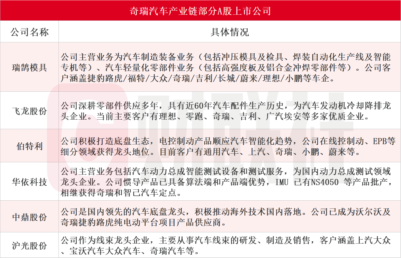 据不完全统计,奇瑞汽车产业链上市公司有瑞鹄模具、飞龙股份、伯特利、华依科技、中鼎股份、沪光股份等,具体情况如下: