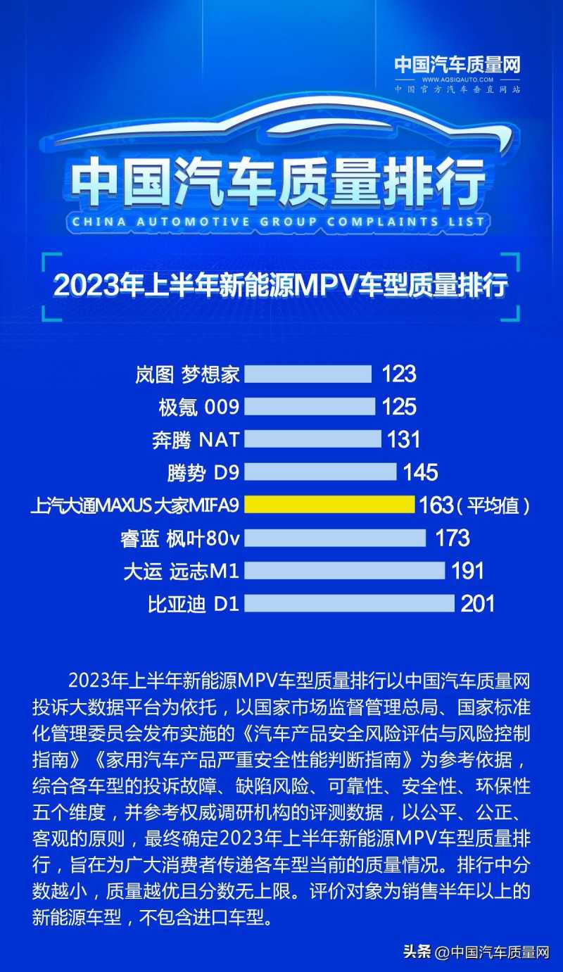 2023年上半年新能源MPV车型质量排行正式发布