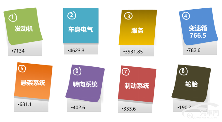 投诉指数: 汽车门网全新构建汽车投诉指数计算模型(简称:QCMS),将车型质量投诉分为八大类,根据发动机、变速箱、车身及电气、制动系统、转向系统、悬挂系统、轮胎、服务等问题影响严重性分别赋权,并对集中性事件额外加权,最终形成有效投诉指数,指数越大越严重。