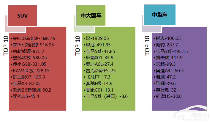 四、从细分车型来看,SUV仍是投诉指数最高的车型,投诉占比高达57%。这背后,比亚迪多车因发动机异常启动招致集中投诉是主要推手。同时,一直投诉不断的丰田皇冠陆放也是主要槽点。中大型车仍排第二,比亚迪汉遭遇集中投诉进一步推高了中大型车的投诉指数,仪表台开裂问题不断的丰田皇冠推波助澜。紧凑型车排名第三,秦PLUS和驱逐舰05因发动机强制启动是投诉的主要爆发点。