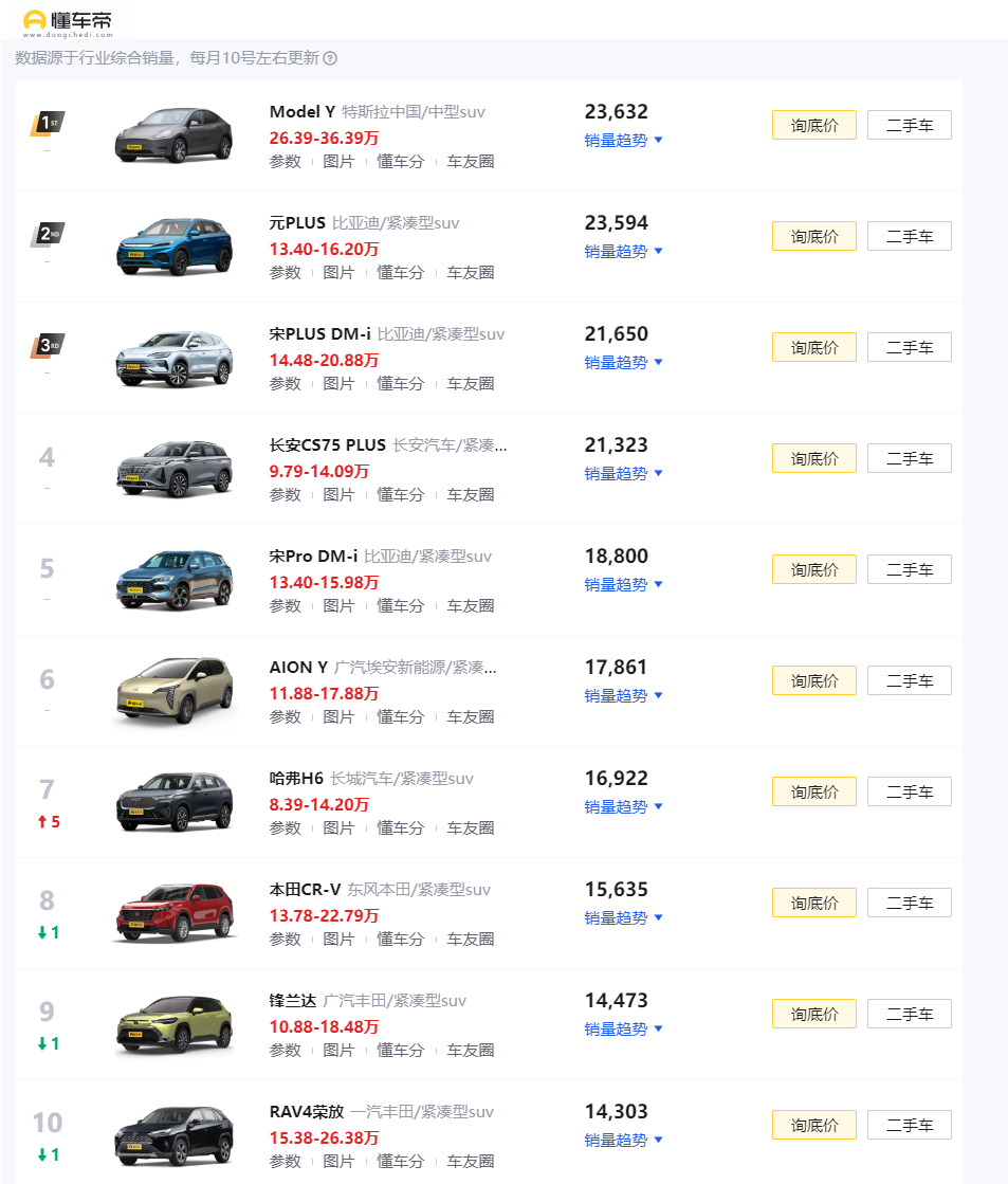 CS75 PLUS,21323辆哈弗H6,16922辆星越L,13389辆前三名还是“老三样”,只是排序发生了变化。