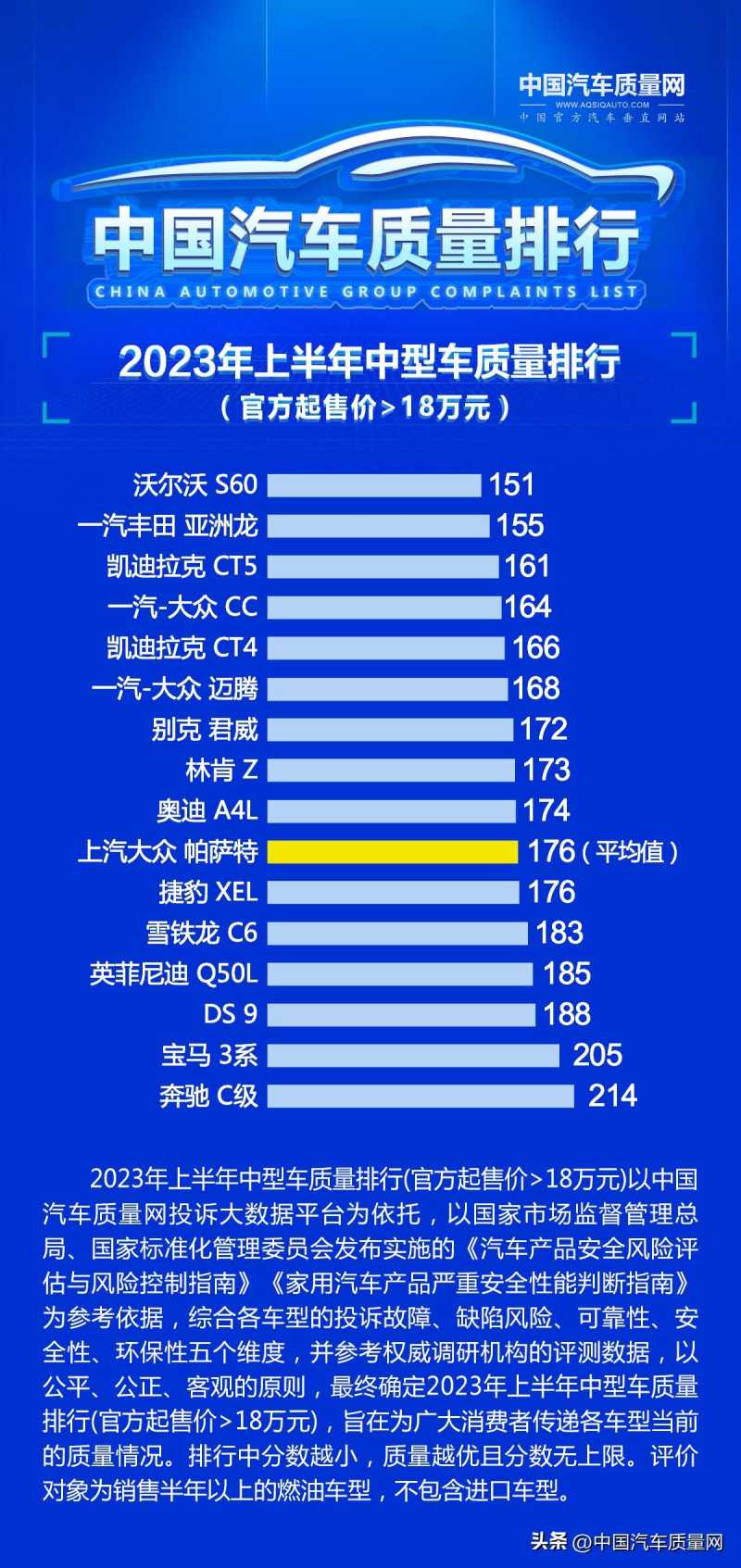 2023年上半年中型车质量排行(官方起售价>18万元)正式发布