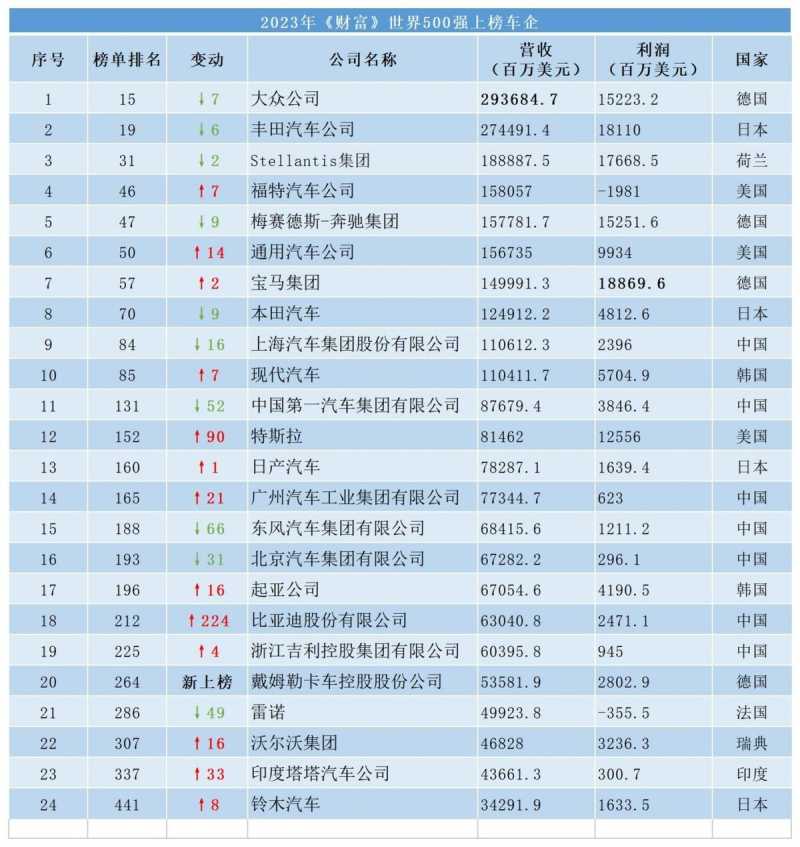 相较于2022年榜单,10家企业的排名出现下滑,雷诺排名滑落最多,从第237名跌至第286名,下降了49名。13家企业的排名上升,比亚迪、特斯拉营收增幅均超过50%,分别前进224个、90个名次。戴姆勒卡车则是首次上榜。