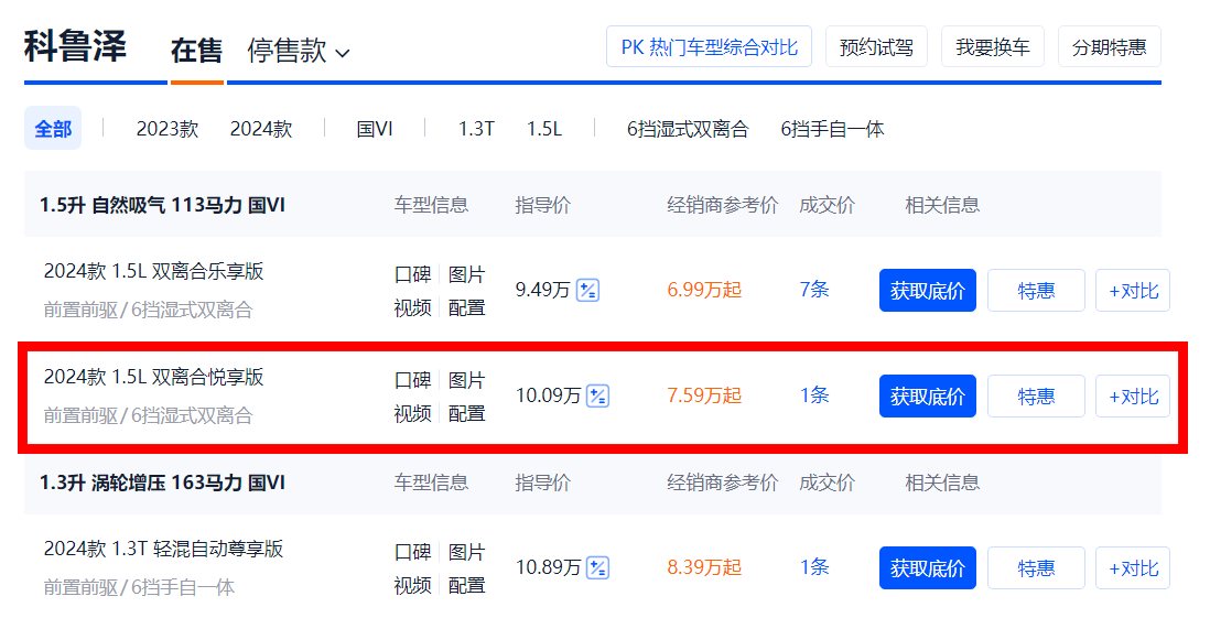 车型配置方面,科鲁泽目前在售的车型有6款,分别是3款2023款车型和3款2024款车型。其中,两个年款的顶配车型都是1.3T的动力,参数更好,但从大多数朋友的购车偏好上考虑,由于它是三缸机,所以大家要去买的话,并不推荐。
