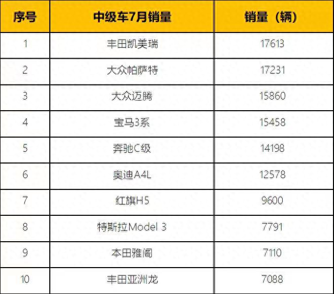 7月最好卖的十大中级轿车:凯美瑞排第一,雅阁跌出前五