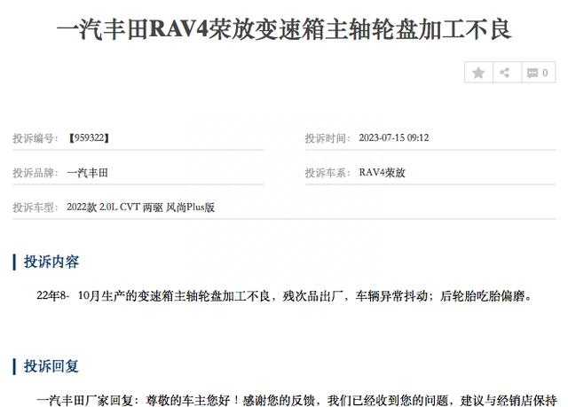此外,一汽丰田RAV4荣放也因投诉“变速箱振动;偏神经”而名列榜单第13位。2022款2.0LCVT两驱城市版车主称:“车子处于N或P档,1100转一踩油门车子就冻结了,当然这是违法的。一汽丰田偷偷送车去4S车间Plan承认曲轴齿轮有缺陷,齿轮总成需要更换,没有退货或延长保修,车主承担所有损失。另一名车主表示,曲轴齿轮是2022年8月-2022年10月制造的车辆保养不当、发错产品、车辆异常晃动、后轮无意识损坏。