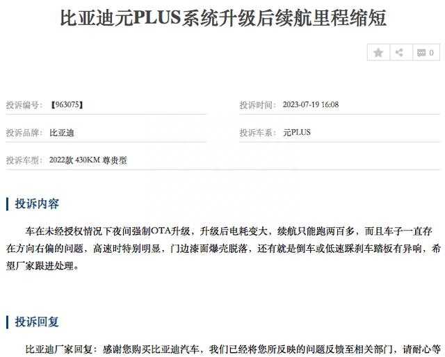 比亚迪元PLUS2022款430公里尊贵车型车主表示:“该车未经许可,在夜间强制更新OTA,高速行驶时问题尤其明显,车门侧面颜色有裂纹、有裂纹,有异常低速转弯或踩刹车踏板时发出声音,希望厂家跟进解决问题。”
