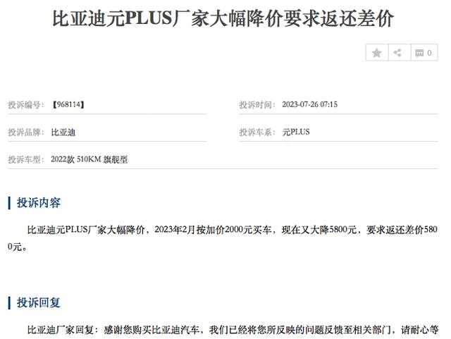 此外,还存在“价格操纵”等“老”问题。造成这种情况的主要原因是比亚迪新车型的价格相对便宜,引起了老车主的不满。旗舰比亚迪元PLUS2022510KM车主表示:“比亚迪元PLUS厂家大幅降价,2023年2月我买的车价格涨了2000元,现在降到了5800元,我得退差价。”5800元。”