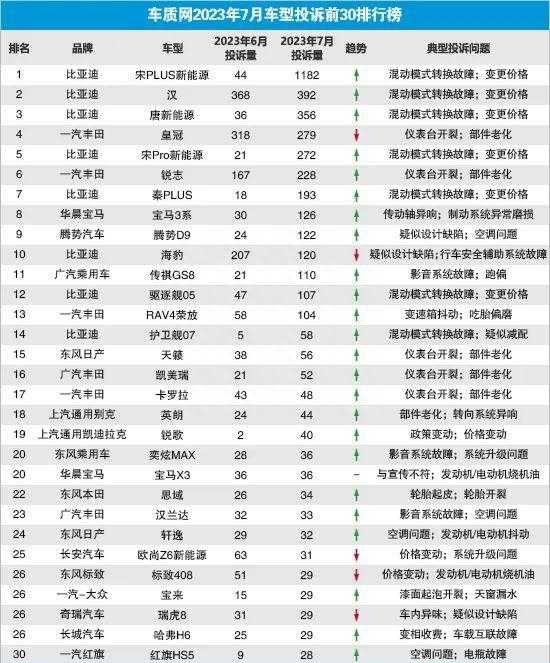 从《2023年2023年7月车型投诉榜》来看,比亚迪再次成为投诉榜单前十车型中的“常客”。其旗下多款车型,包括宋PLUS新能源、汉唐新能源、宋临新能源、秦PLUS、海尔等均跻身投诉前十名,成为7月份上榜车型最多的品牌。此外,一汽丰田皇冠、锐志、RAV4荣放等多款车型也出现在榜单中。