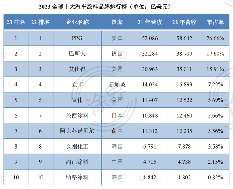 2023全球十大汽车涂料品牌榜揭晓:收入大幅增长,市占率提至91%
