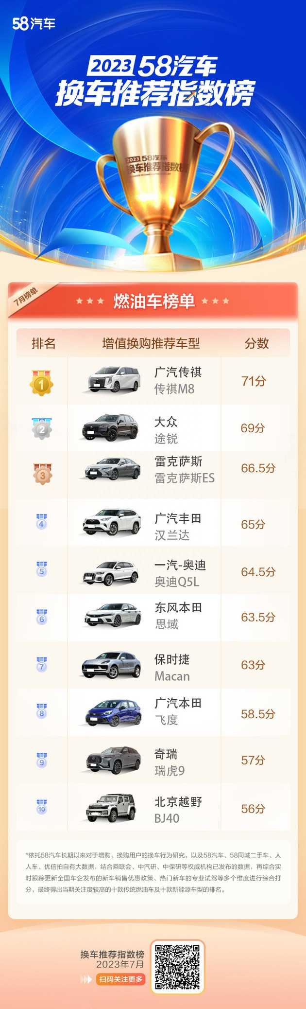 《58汽车换车推荐指数榜》燃油车 传祺M8/途锐/雷克萨斯ES排名前三
