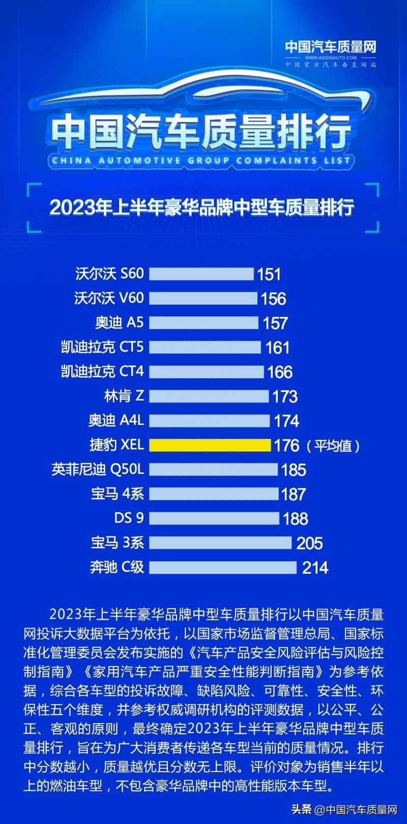 2023年上半年豪华品牌中型车质量排行以中国汽车质量网投诉大数据平台为依托,以国家市场监督管理总局、国家标准化管理委员会发布实施的《汽车产品安全风险评估与风险控制指南》《家用汽车产品严重安全性能判断指南》为参考依据,综合各车型的投诉故障、缺陷风险、可靠性、安全性、环保性五个维度,并参考权威调研机构的评测数据,以公平、公正、客观的原则,最终确定2023年上半年豪华品牌中型车质量排行,旨在为广大消费者传递各车型当前的质量情况。排行中分数越小,质量越优且分数无上限。评价对象为销售半年以上的燃油车型,不包含豪华品牌中的高性能版本车型。