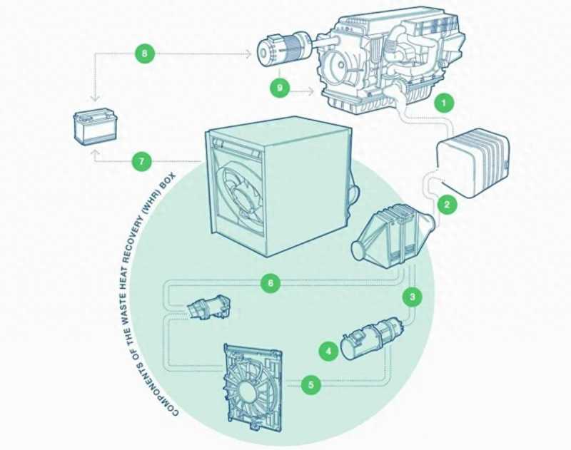 根据德国马勒公司介绍,这套系统集成在一个量仅为150千克的盒子中,其工作原理简单介绍是发动机排出的气体通过管道进入装置内的蒸发器,该蒸发器含有低沸点的液体,会在高温尾气的热量下气化,进入活塞膨胀机推动活塞膨胀剂运转输出动能进行发电;之后该气体进入冷凝器降温,转化为液体,重新进入蒸发器进行反复工作。