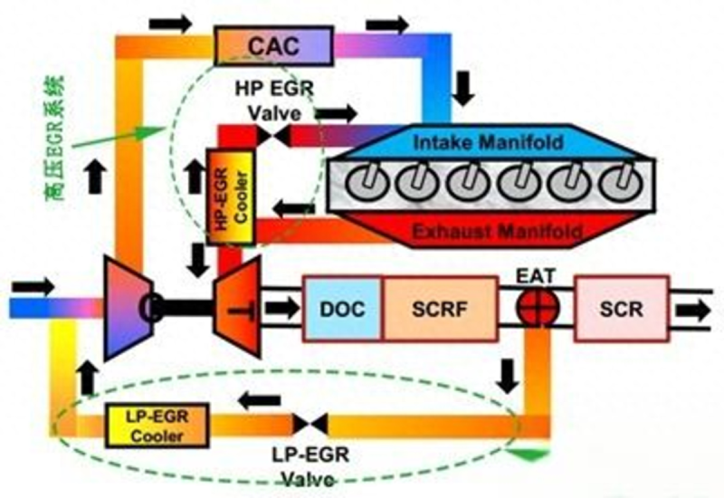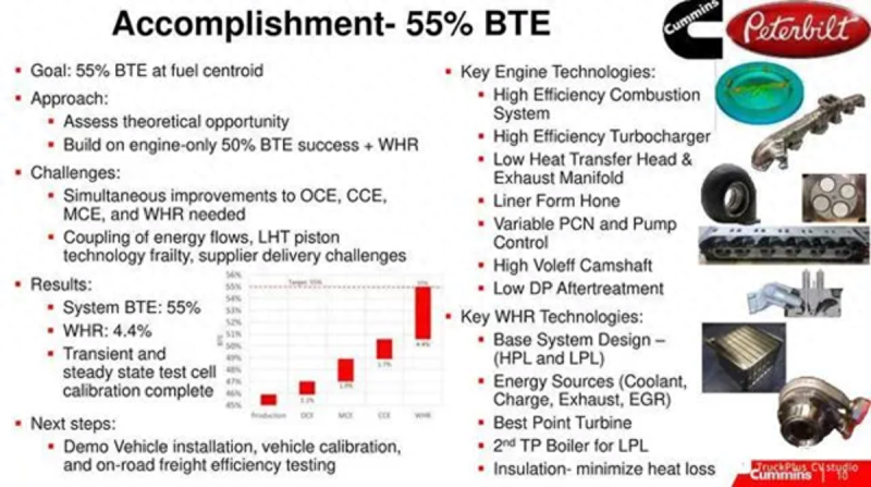在实际应用中,康明斯采用高于传统喷油器流量三倍的高流量喷油器,将冷却高压EGR升级为高低压复合EGR,加上双通道涡轮增压系统以及对排气歧管机型升级,以及名为“DOC+SCRF Closed-Coupled +SCR”的后处理技术,最后通过一系列的机械效率提升和余热回收系统的优化,从而将康明斯发动机的制动热效率从原来的51%突破到的55%。