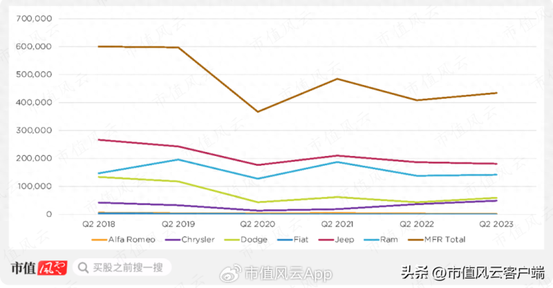 2023Q2,Stellantis在美销售43.45万辆汽车,较去年同期增长6%。但考虑2023Q2美国汽车行业整体同比增长17%,Stellantis在美国市场的增长在行业中明显偏低。