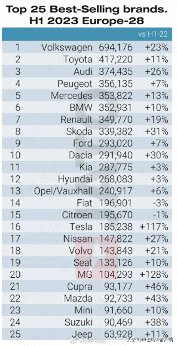 2023H1,在欧洲最主要的28个国家,大众汽车旗下有三个品牌能挤进前10(大众、奥迪、斯柯达),而Stellantis能挤进前10的只有标致。