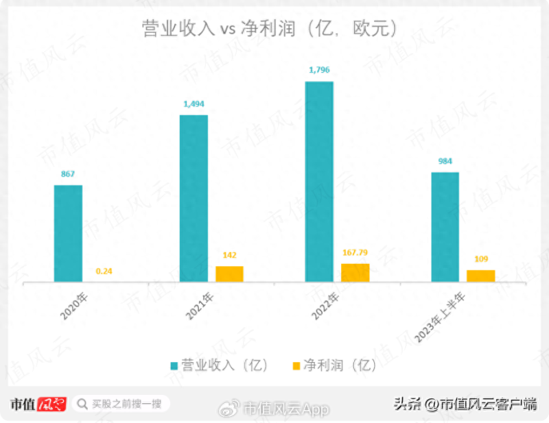 2022年,公司营收1,795.92亿欧元(同比20.19%,本文除额外说明,金额单位默认欧元),毛利率19.64%,净利167.79亿欧元(同比+18.1%)。