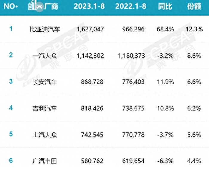汽车厂商前8个月销量出炉:长安吉利超上汽大众,比亚迪夺魁