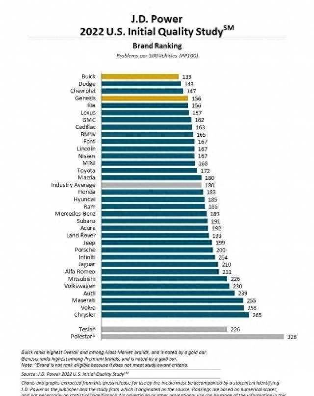 最近,J.D.Power发布了一项针对2022年2月至5月的美国新车质量调查,他们以每100辆新车在90天内报告的质量问题数量为依据进行排名,问题数量越少,得分就越高。在这项调查中,表现最出色的前三名分别是别克、道奇和雪佛兰,这些都是通用汽车旗下的美国本土品牌。与此不同的是,奔驰、沃尔沃和保时捷等国内销量和口碑良好的品牌,在美国的排名却低于行业平均水平。这引发了一个问题:为什么通用汽车在国内备受质疑,而在美国本土质量表现却如此卓越?