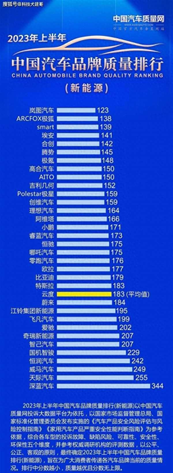 2023年上半年中国汽车品牌质量排行榜(新能源)基于中国汽车质量网大数据投诉平台,依据国家市场监督管理总局、国家标准化管理委员会发布实施的《汽车产品安全风险评估与风险控制指南》《家用汽车产品严重安全性能判断指南》委员会。